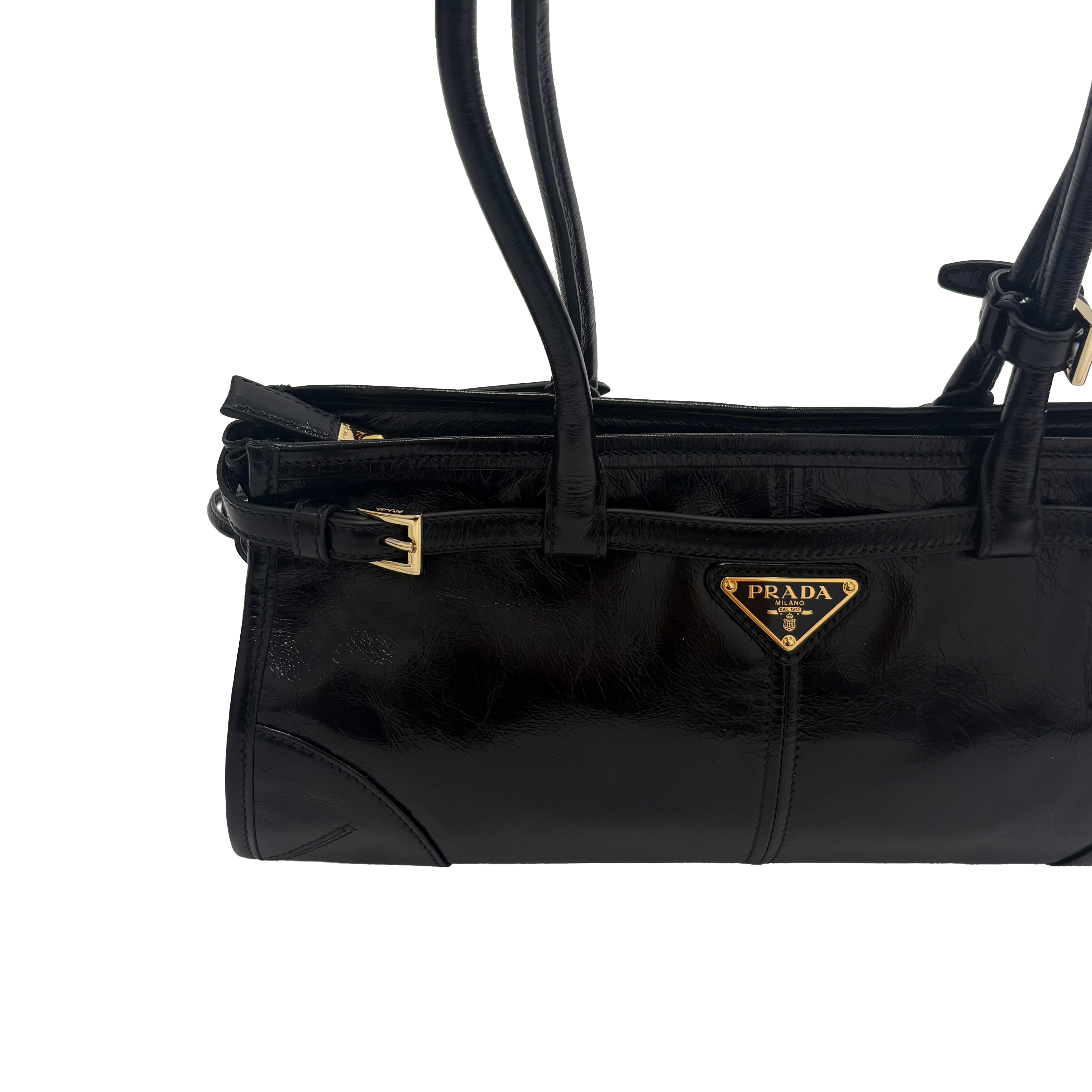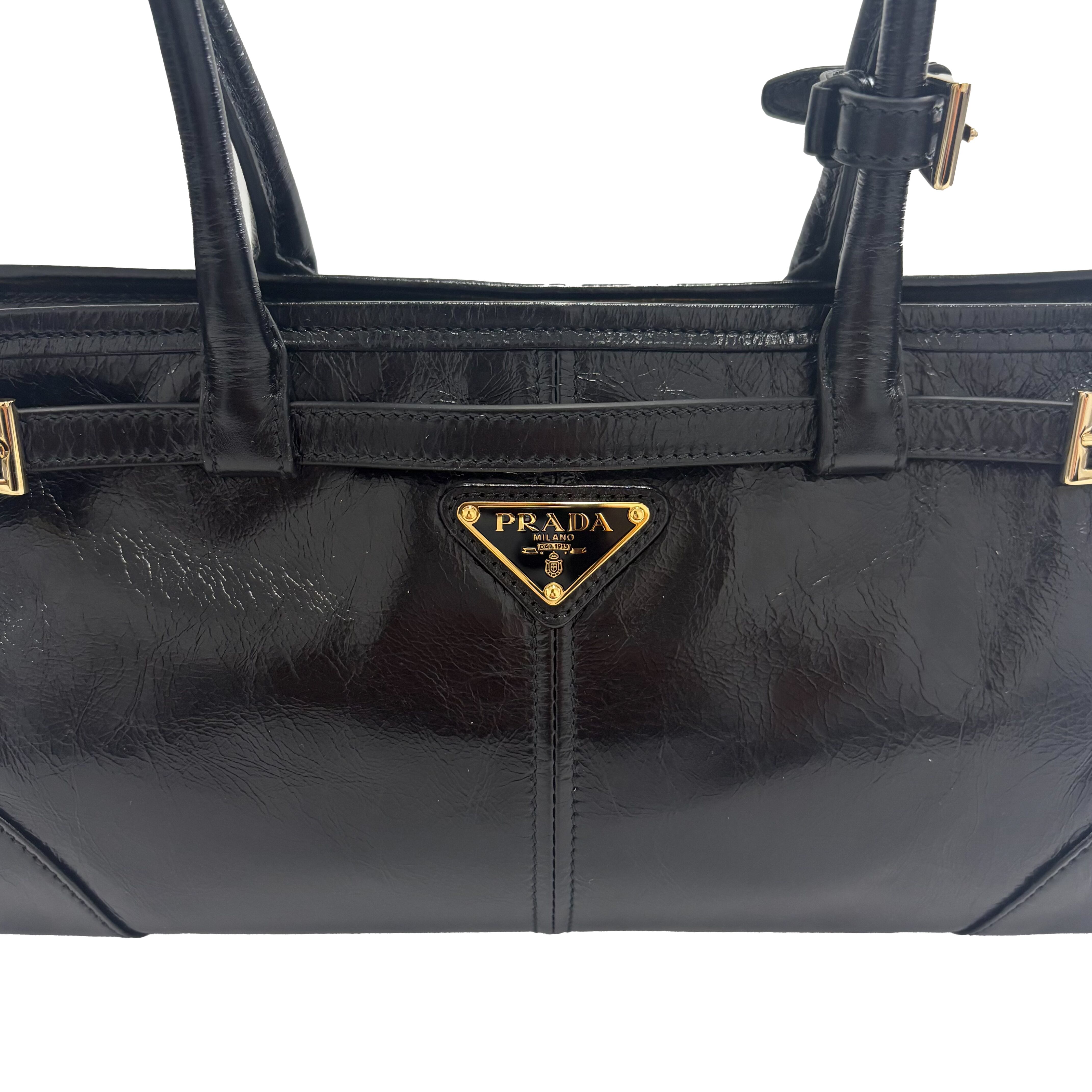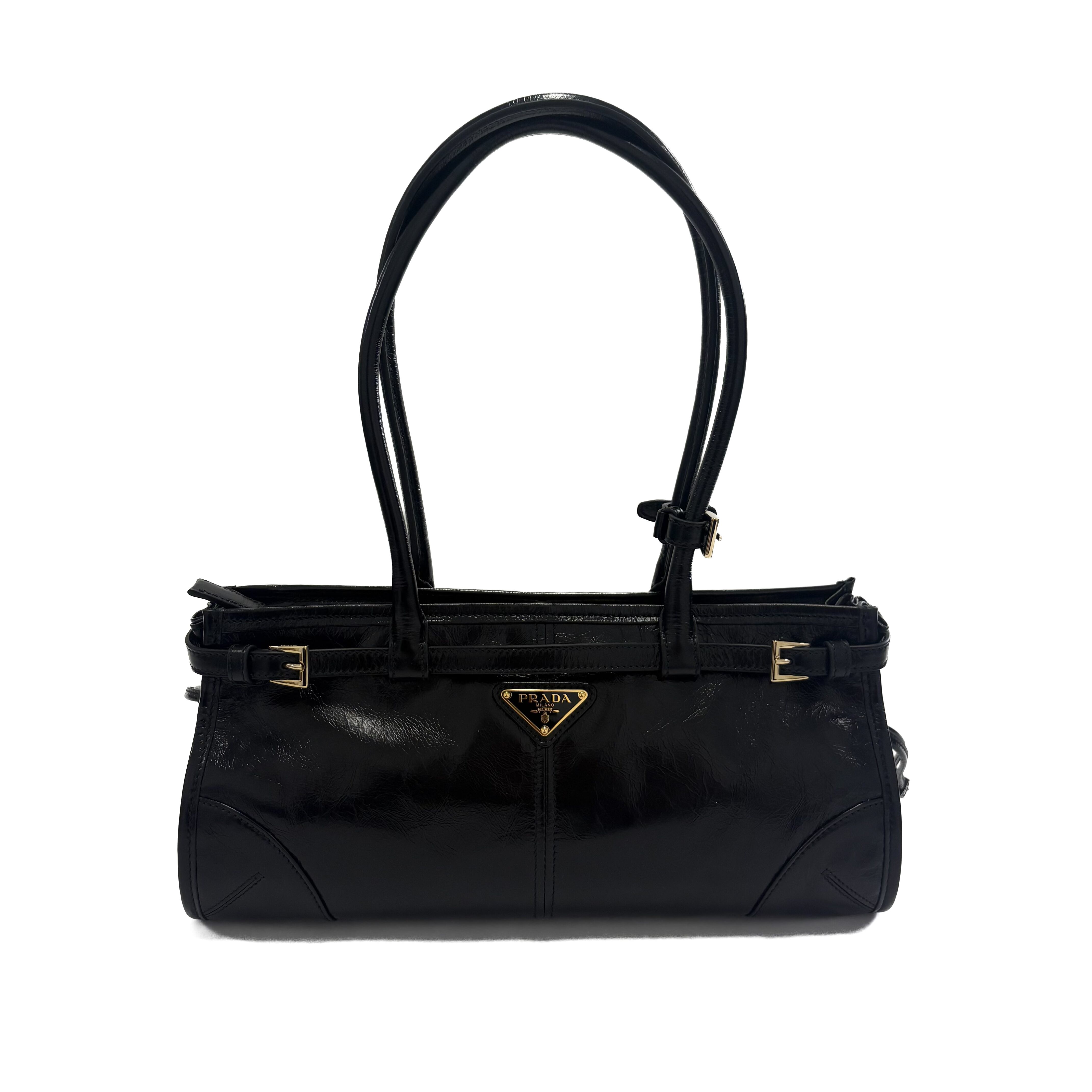 このバッグを持っていたら一日に一回は眺めてしまうであろう、プラダのトライアングルロゴが美しい。