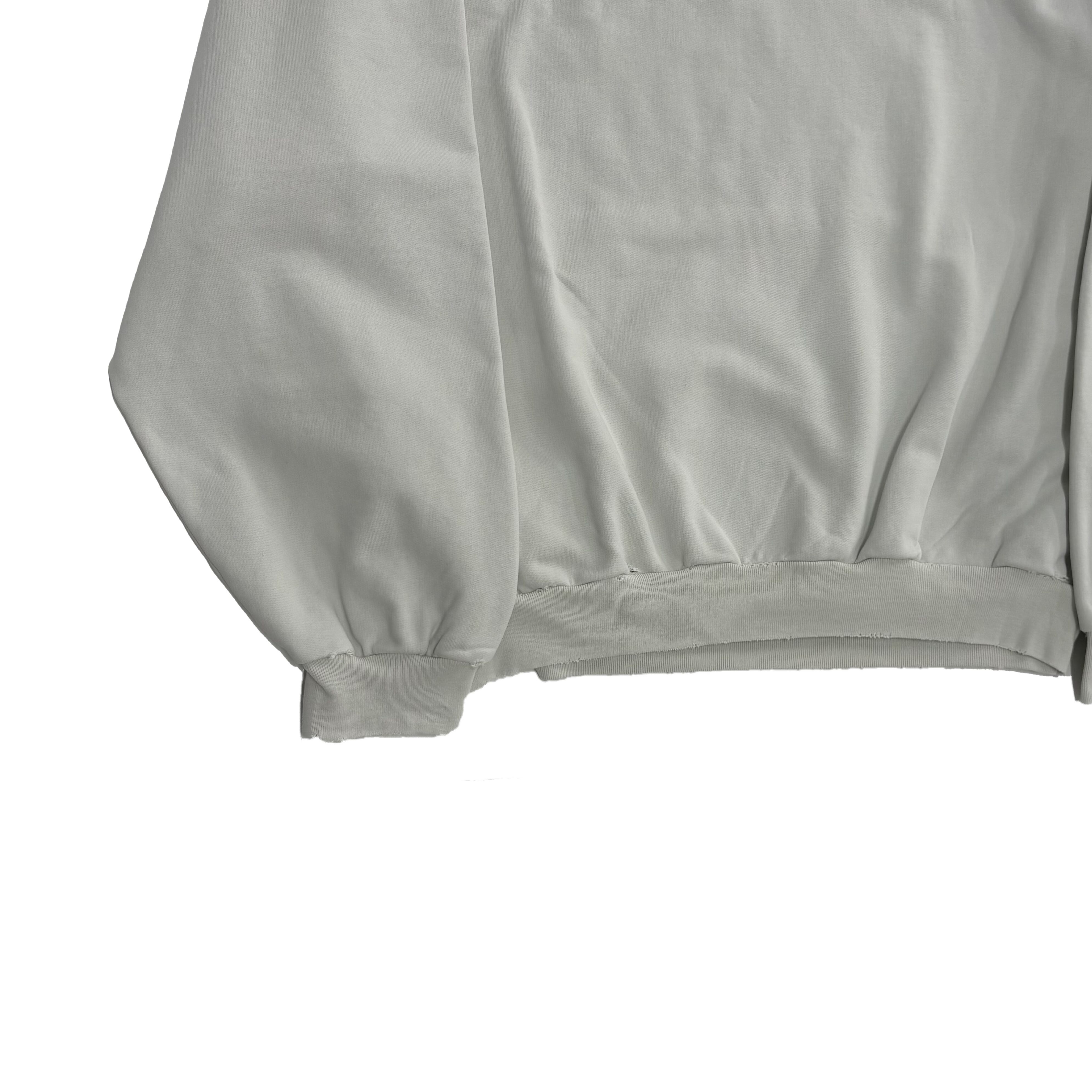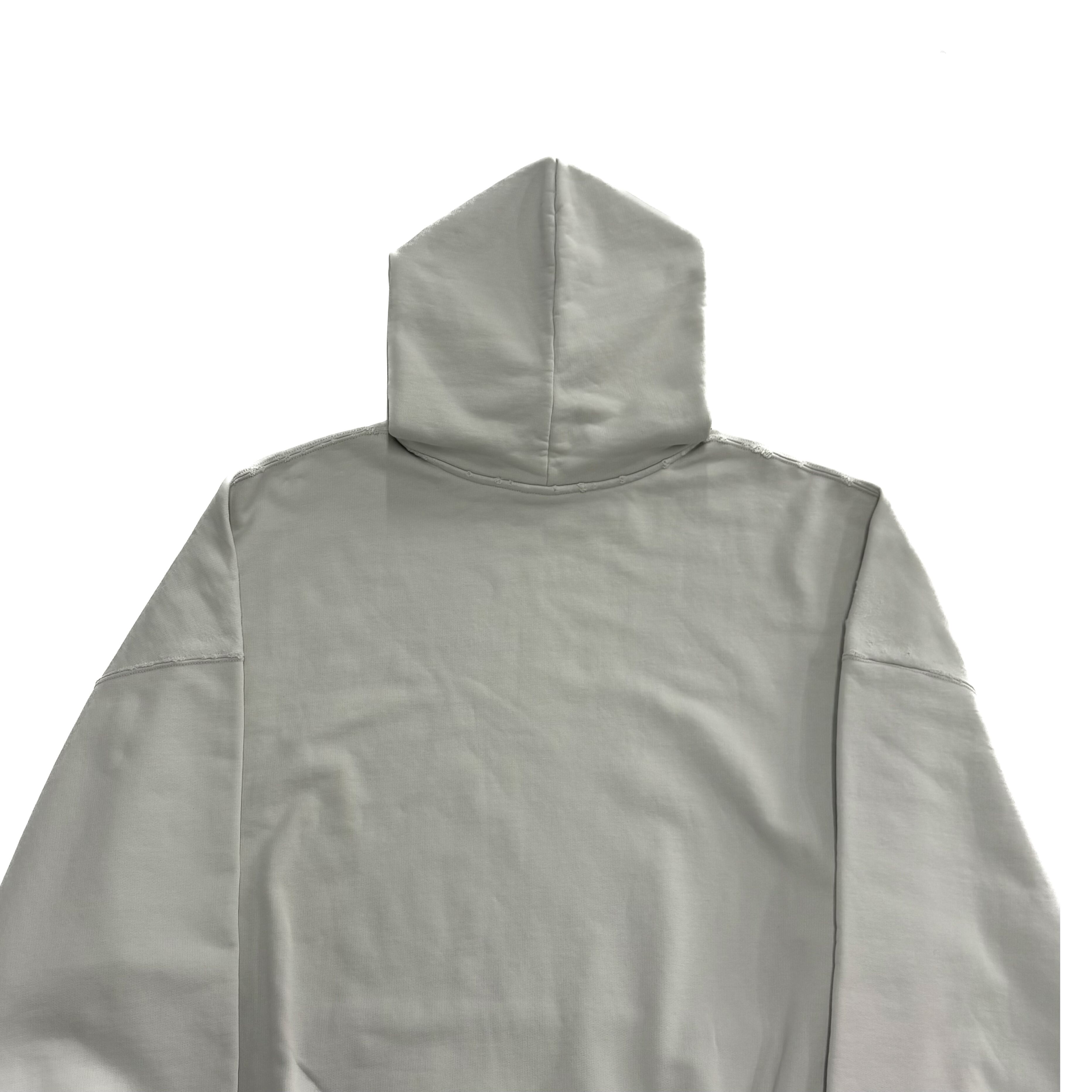 下に垂れていくデザインのロゴが特徴的な、ホワイトのフーディ。