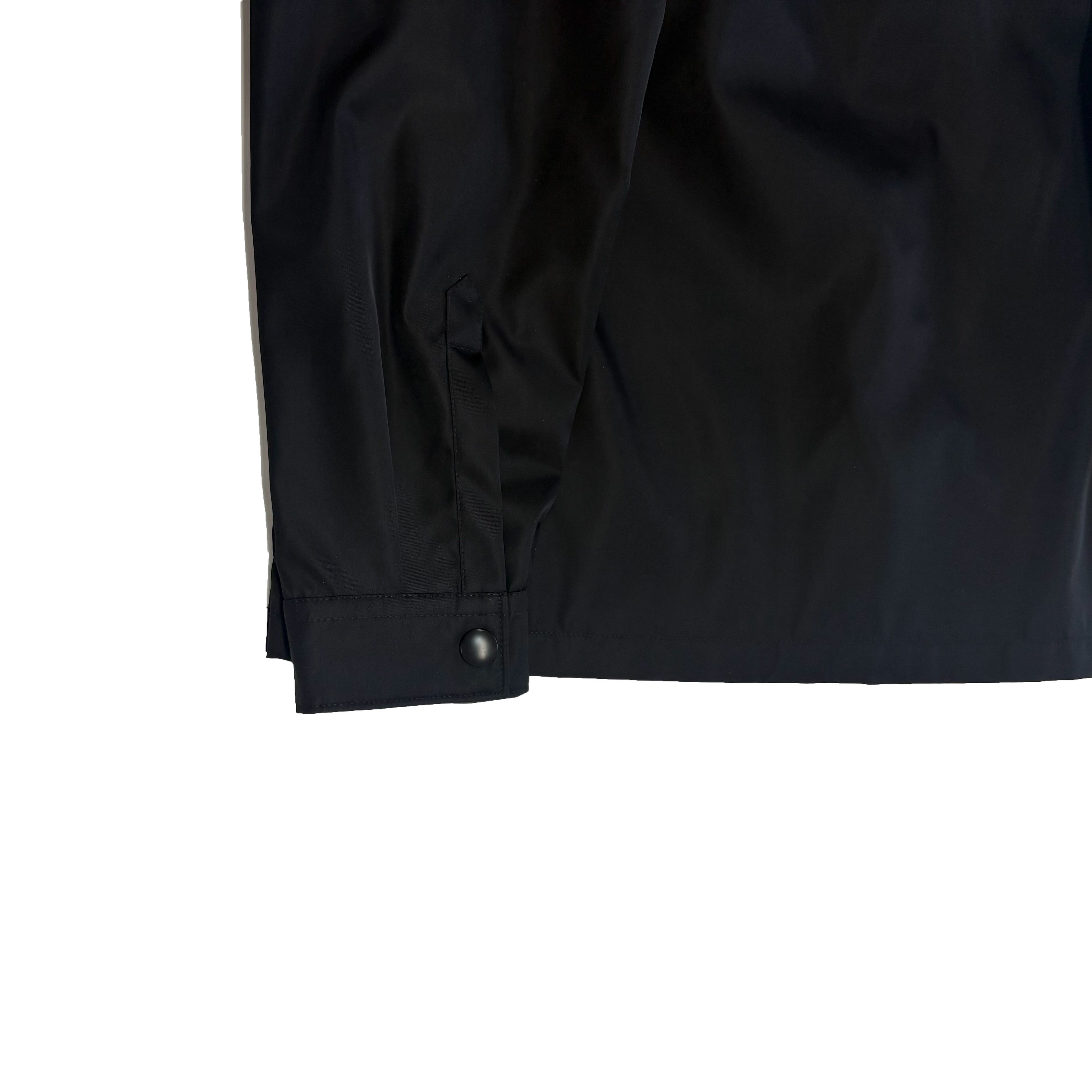 ジャケットとしても使用可能だが、ボタン閉めて1枚でトップスとして使用するのもオススメです。全てナイロン素材ですがポケットのロゴマークやデザインがカジュアルに見えすぎずモードな印象にもしてくれます。