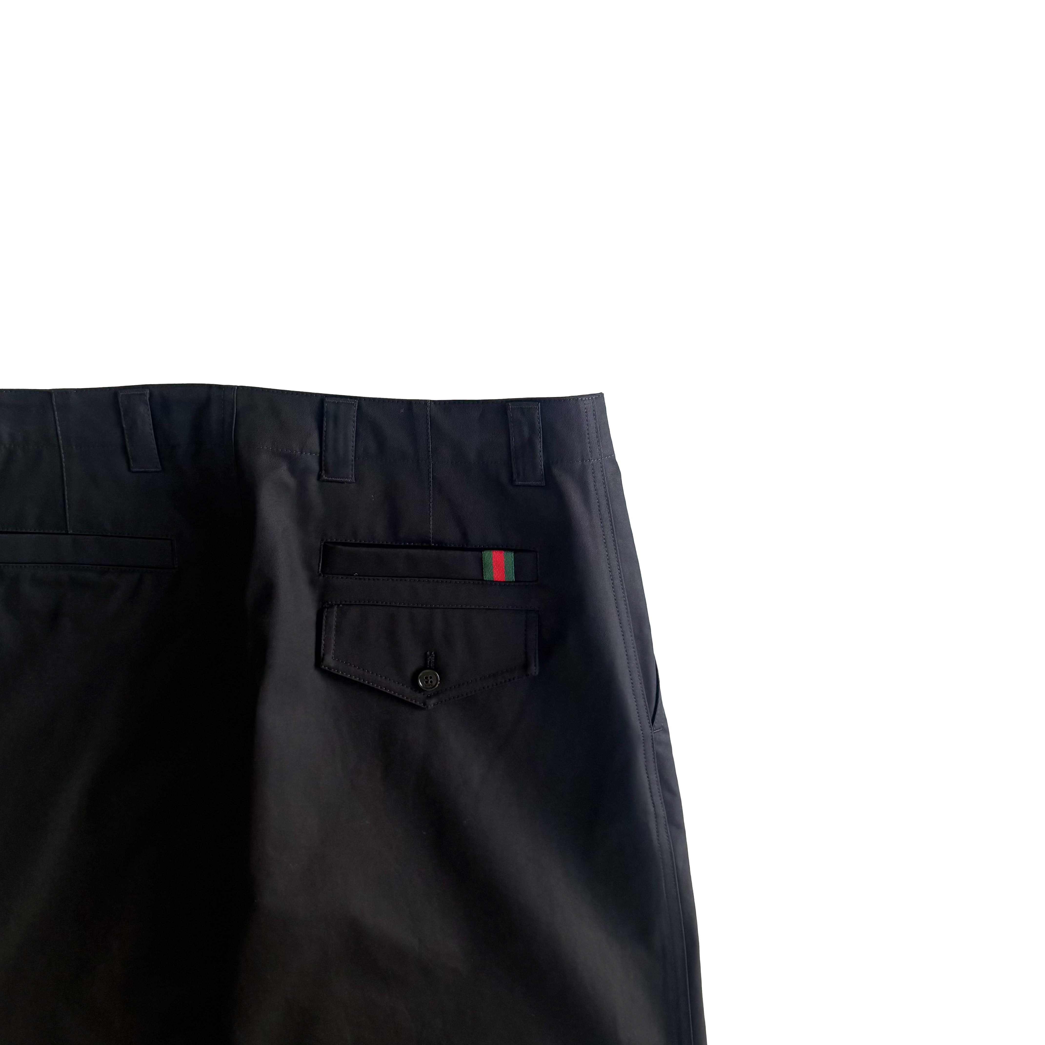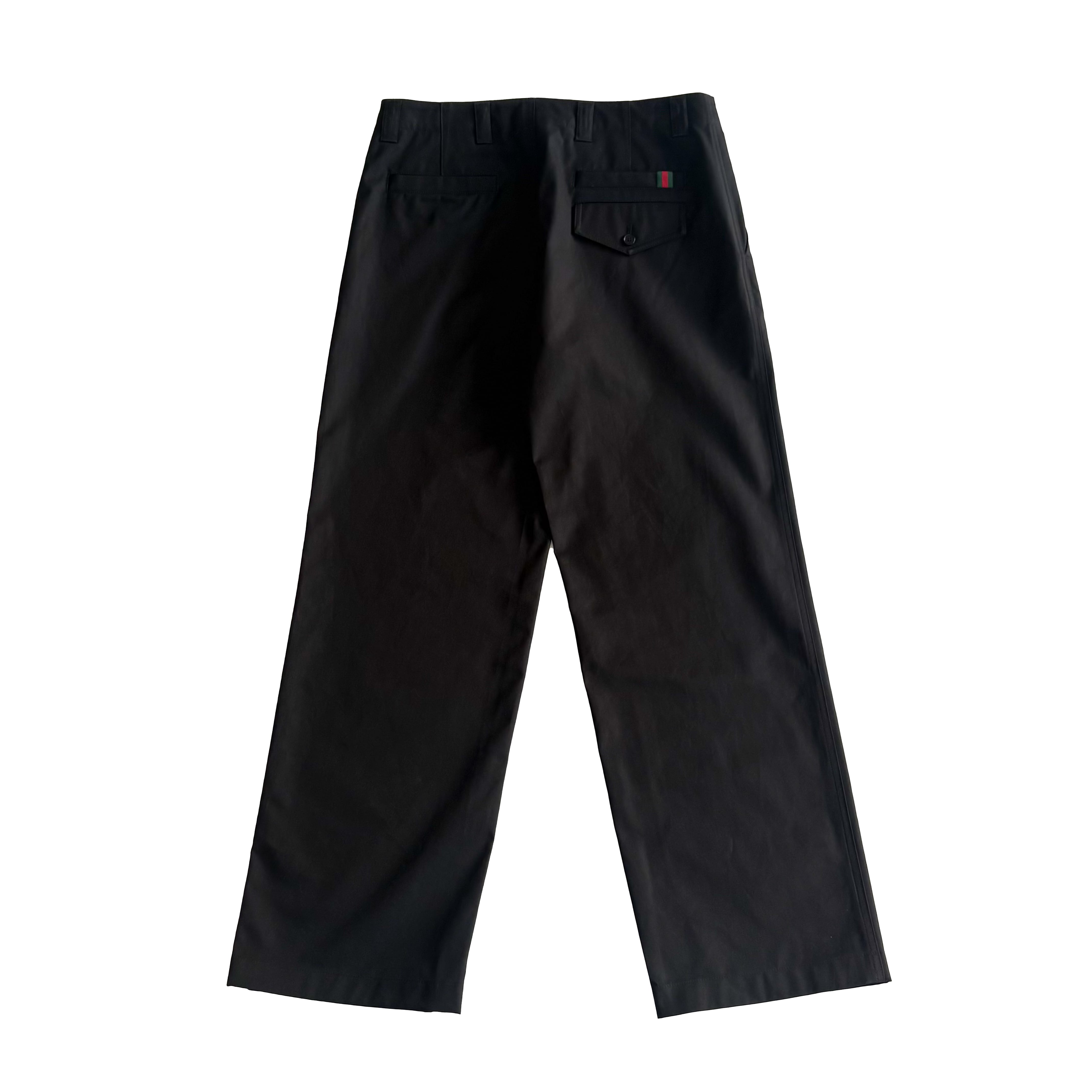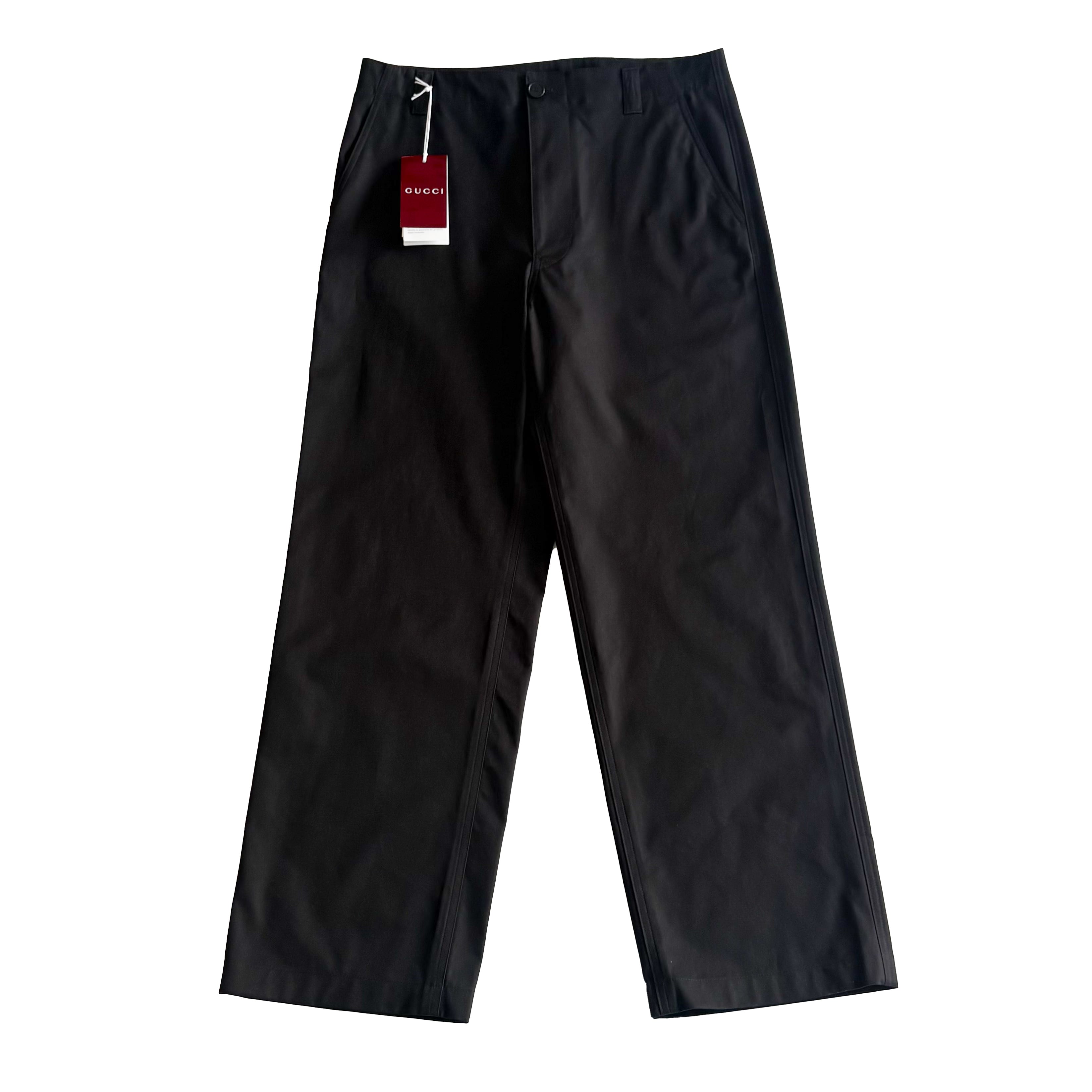 ブラックコットンツイルのグッチパンツ。フロントジッパーとボタン留め、ベルトループ、背面にグッチ定番のグリーン、レッド、グリーンのウェブラベルのデザインがさりげなくデザインされており、カジュアルスタイルから上品スタイルまで叶うパンツです。