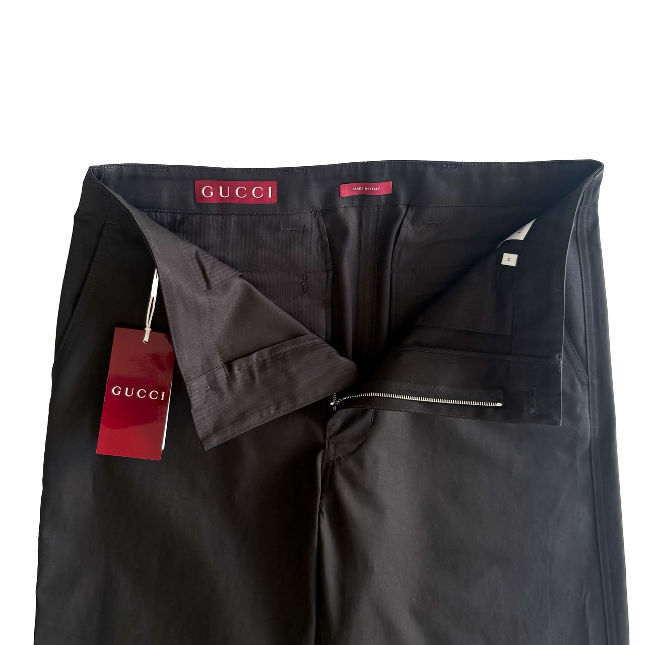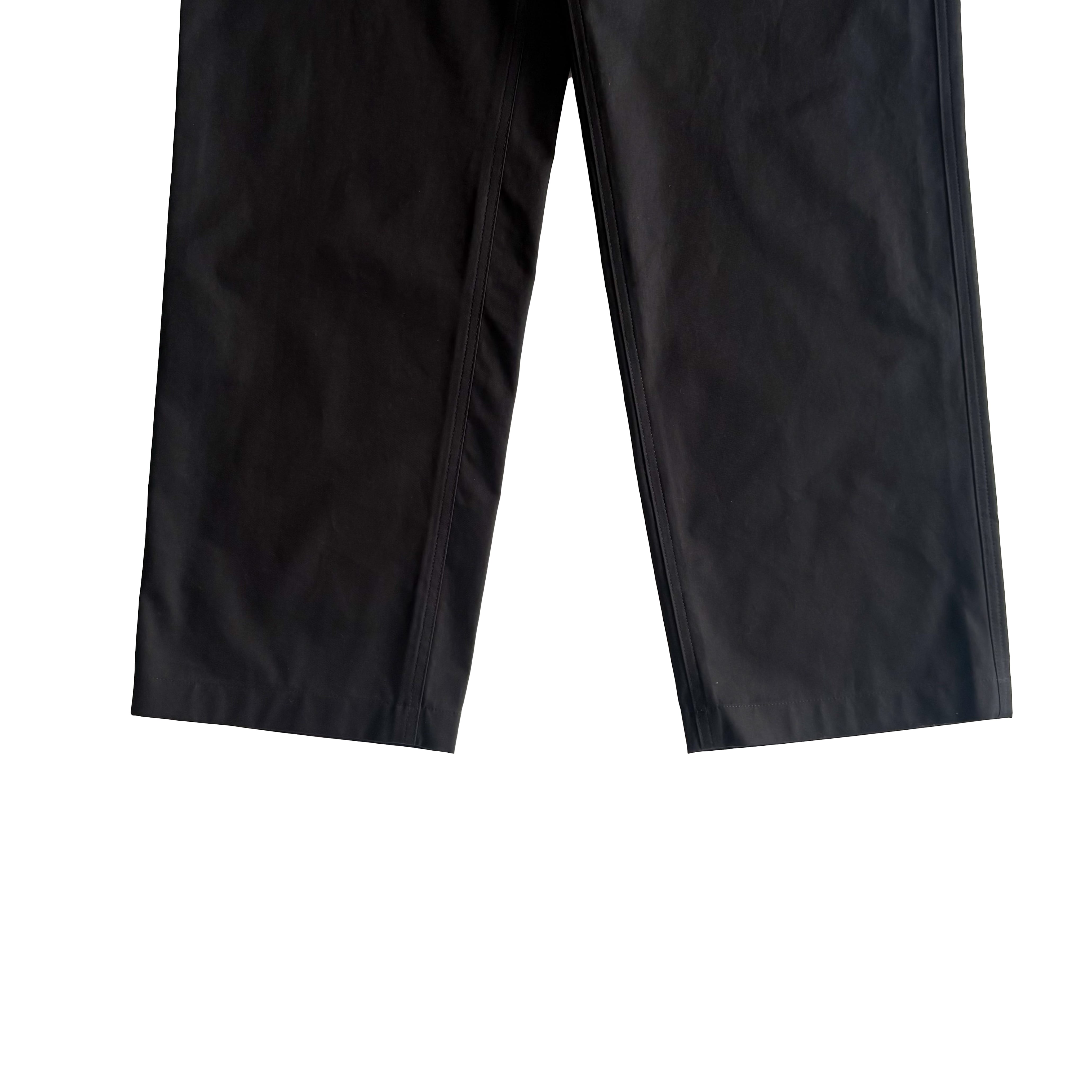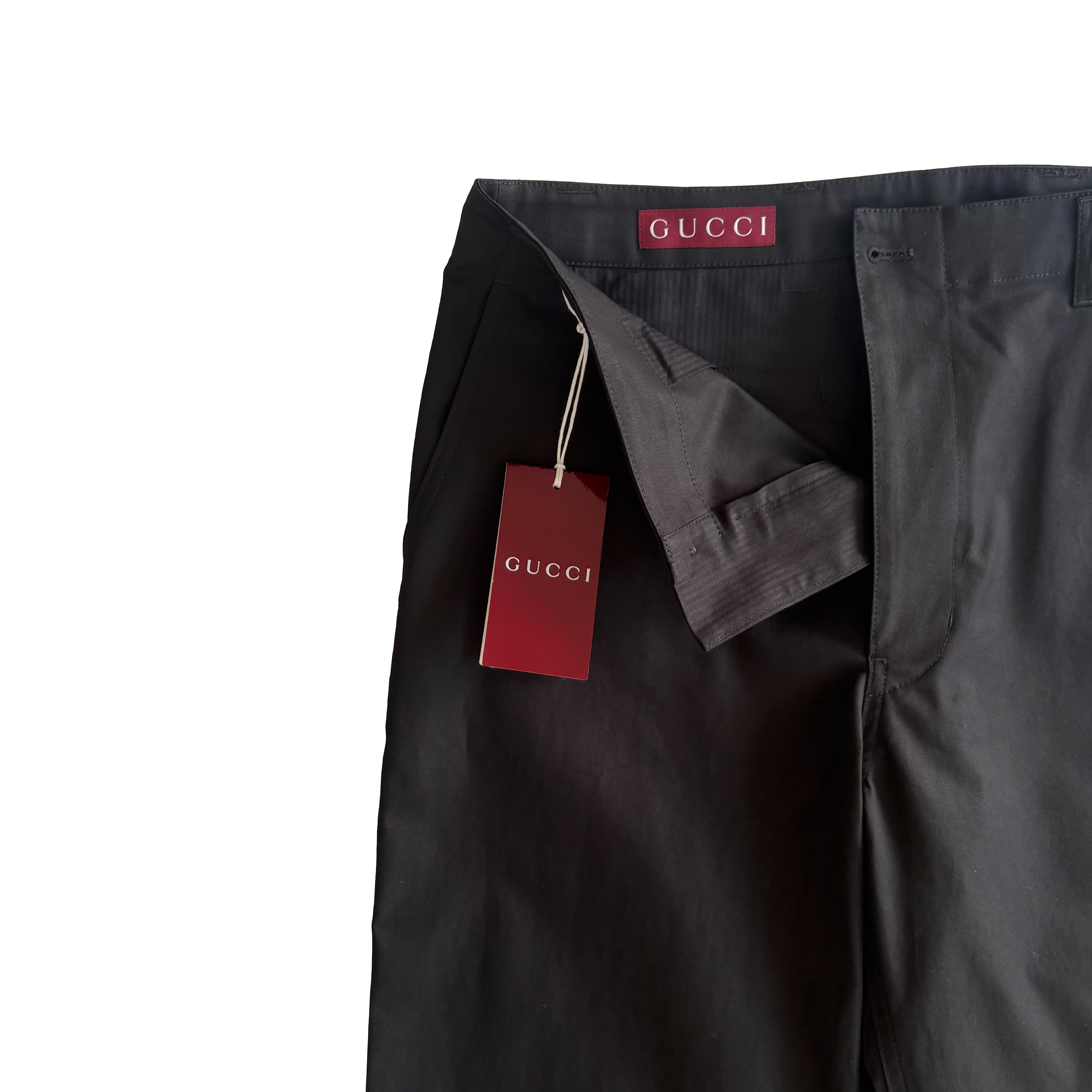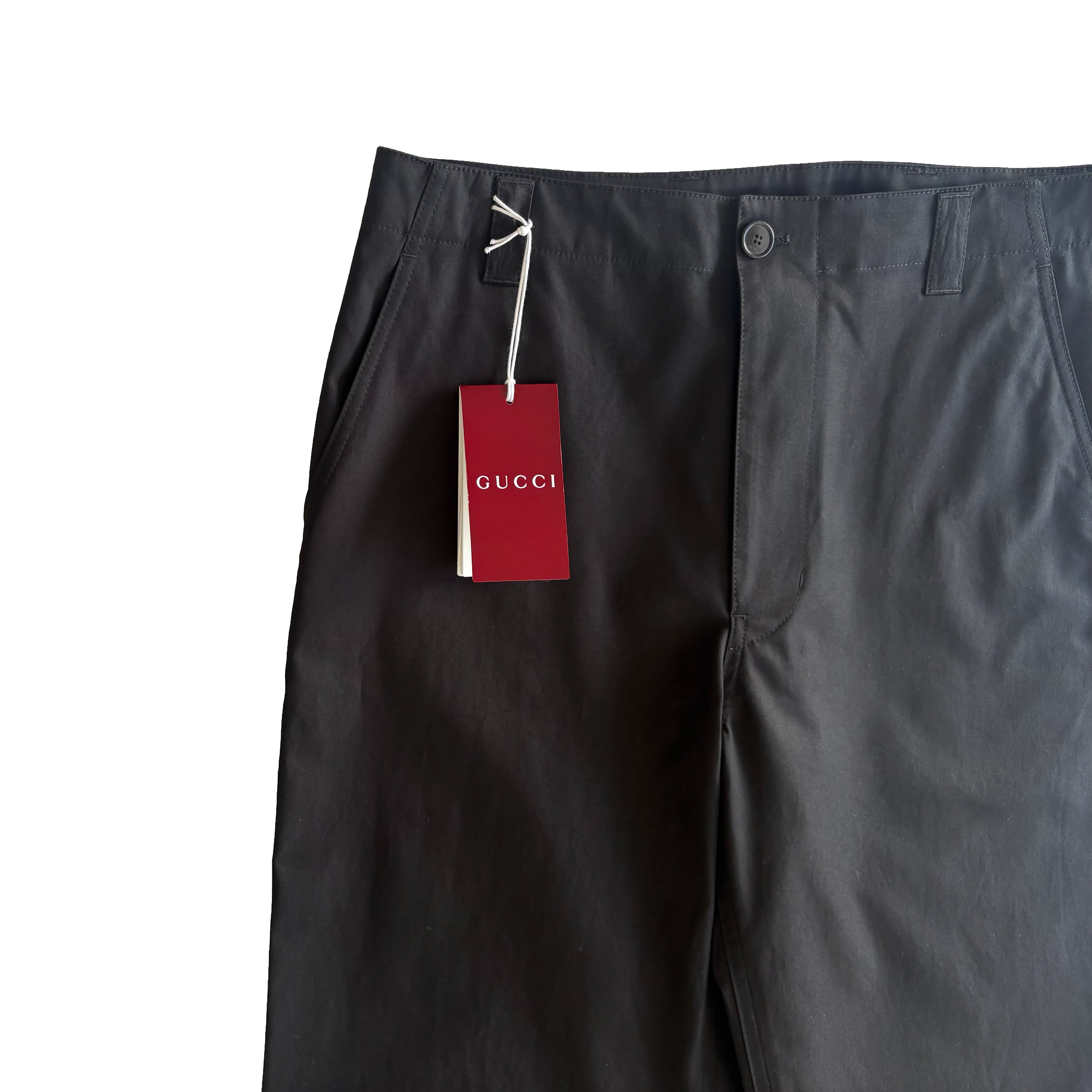 ブラックコットンツイルのグッチパンツ。フロントジッパーとボタン留め、ベルトループ、背面にグッチ定番のグリーン、レッド、グリーンのウェブラベルのデザインがさりげなくデザインされており、カジュアルスタイルから上品スタイルまで叶うパンツです。