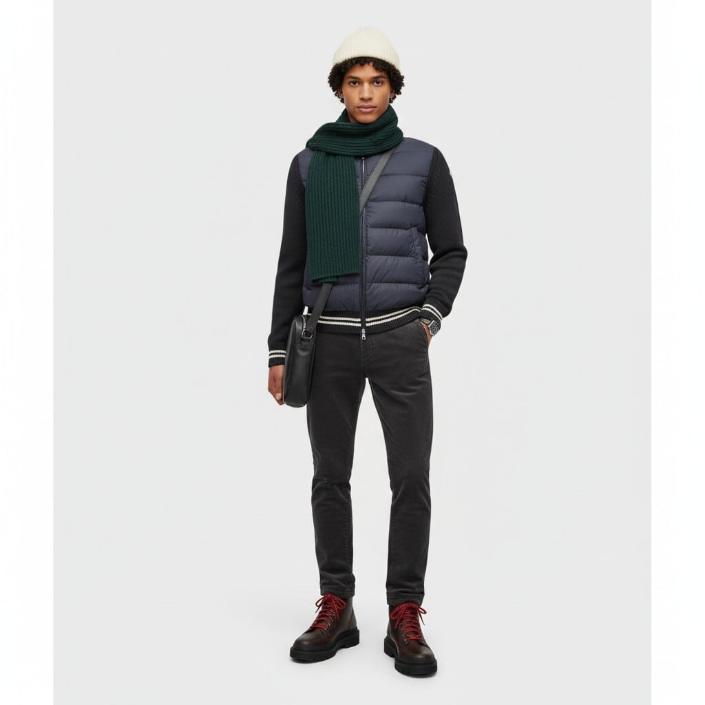 着心地は軽やかで、ニットカーディガンとダウンのバランスがおしゃれです。