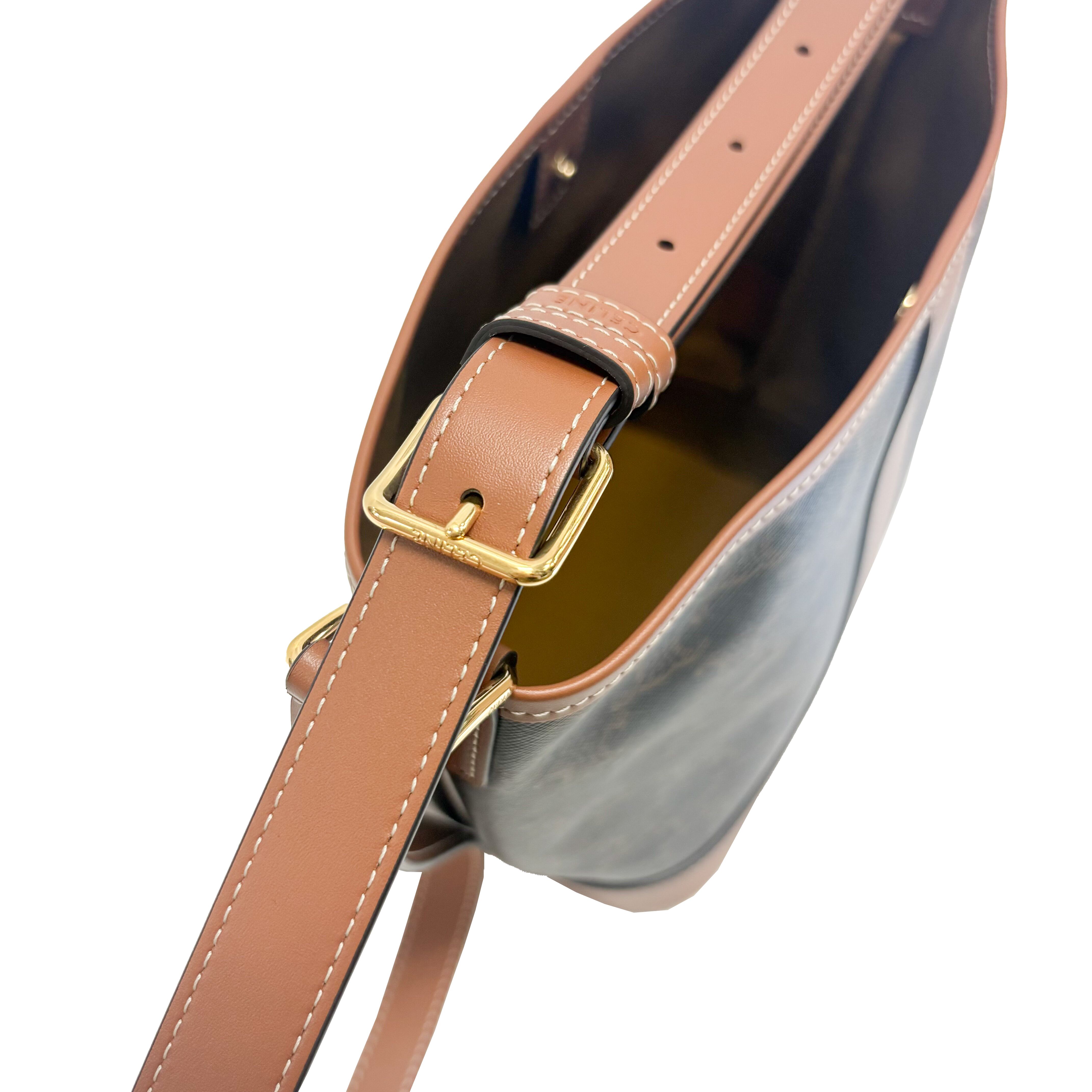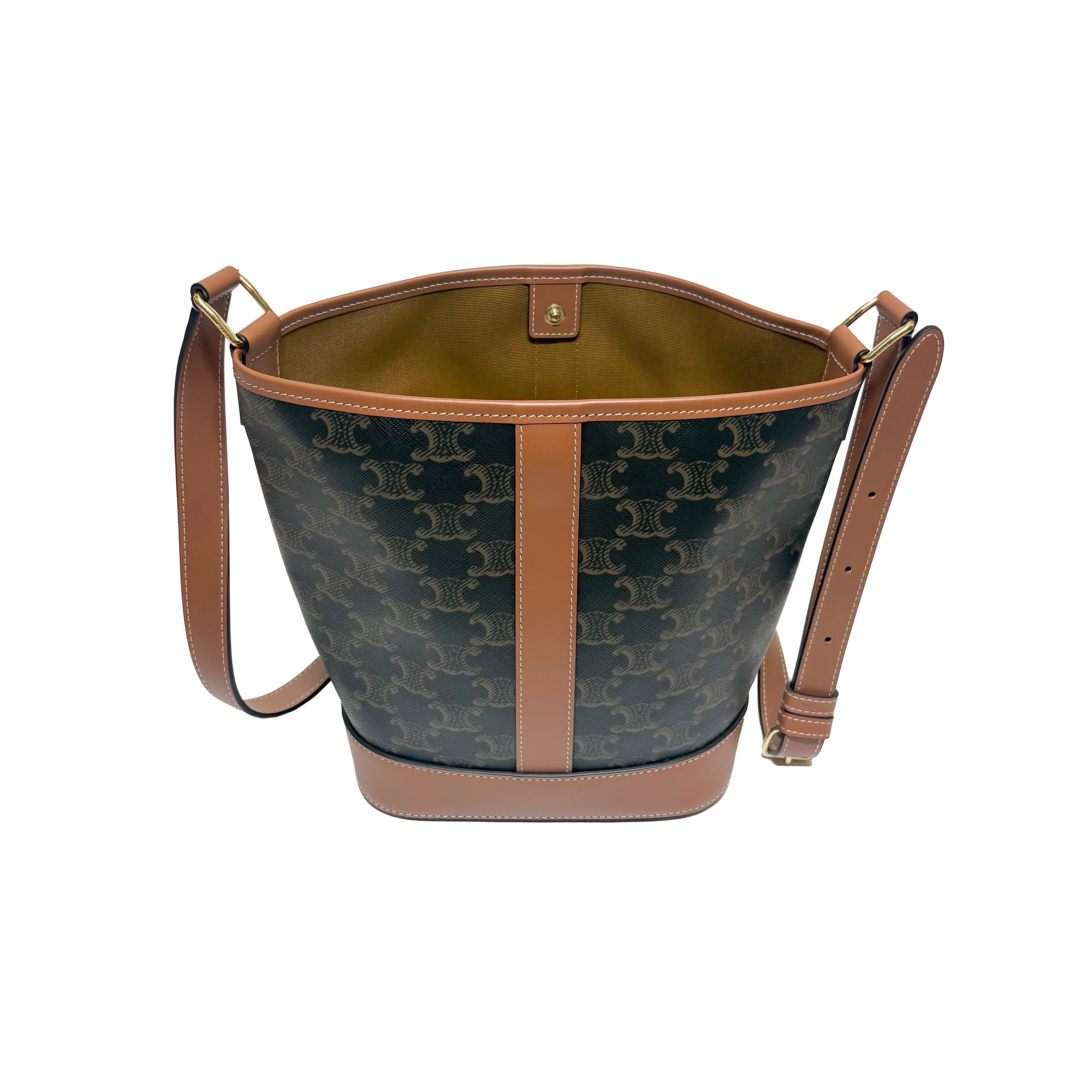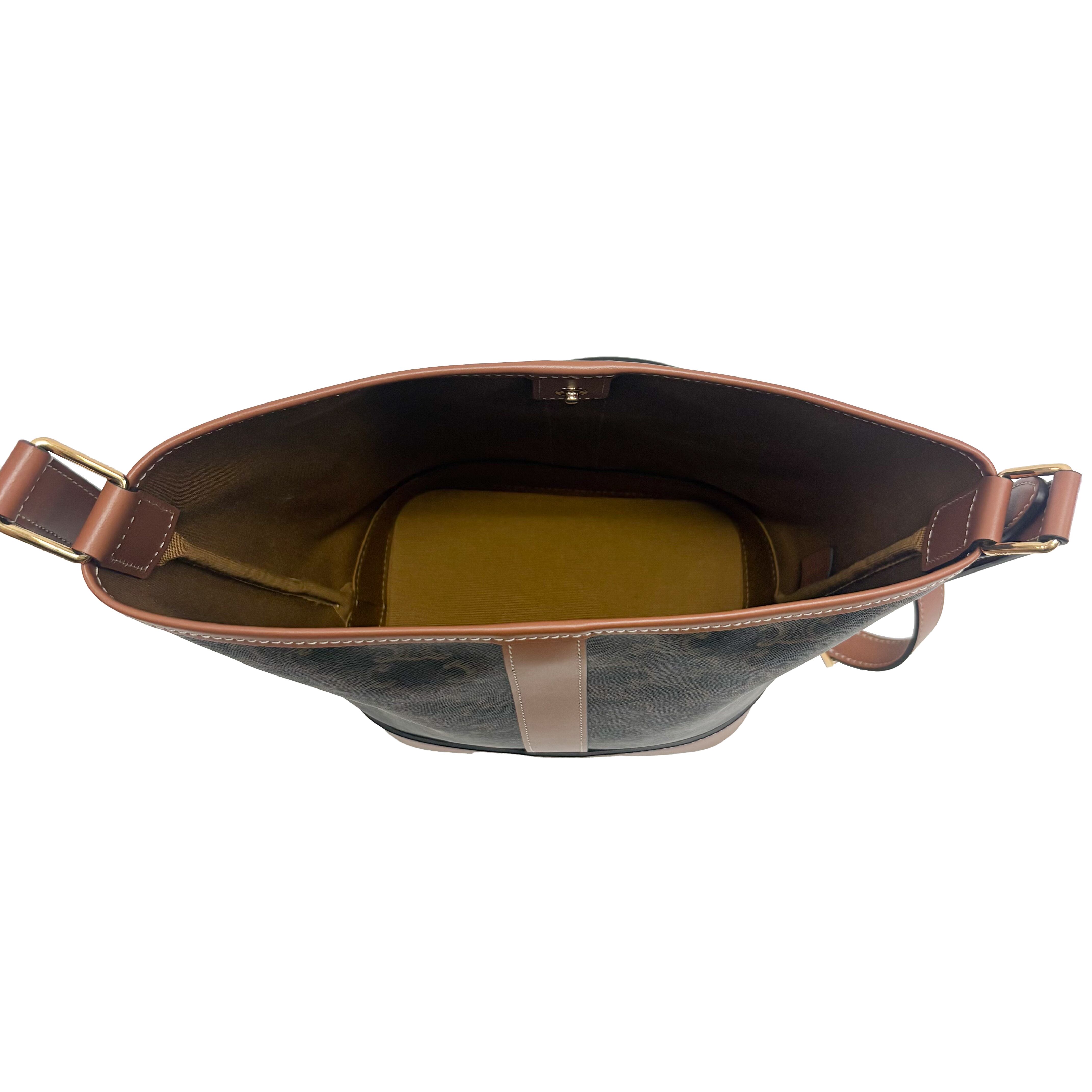 "タイムレス" をコンセプトにデザインされた「TRIOMPHE CANVAS」を使用したコレクション。古き良きオールド・セリーヌを感じさせる "トリオンフモチーフ " はCELINEのアイコンシンボル。本作はクラシカルなトリオンフ キャンバスとレザーディテールを上品に組み合わせたバケットバッグです。普段使用しやすいバケットタイプで、大きさも程よくどんなコーディネートとでも合います。