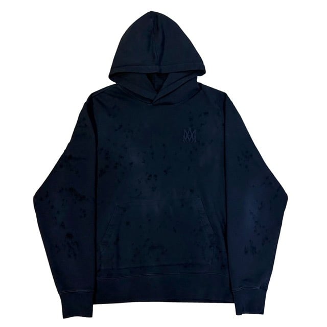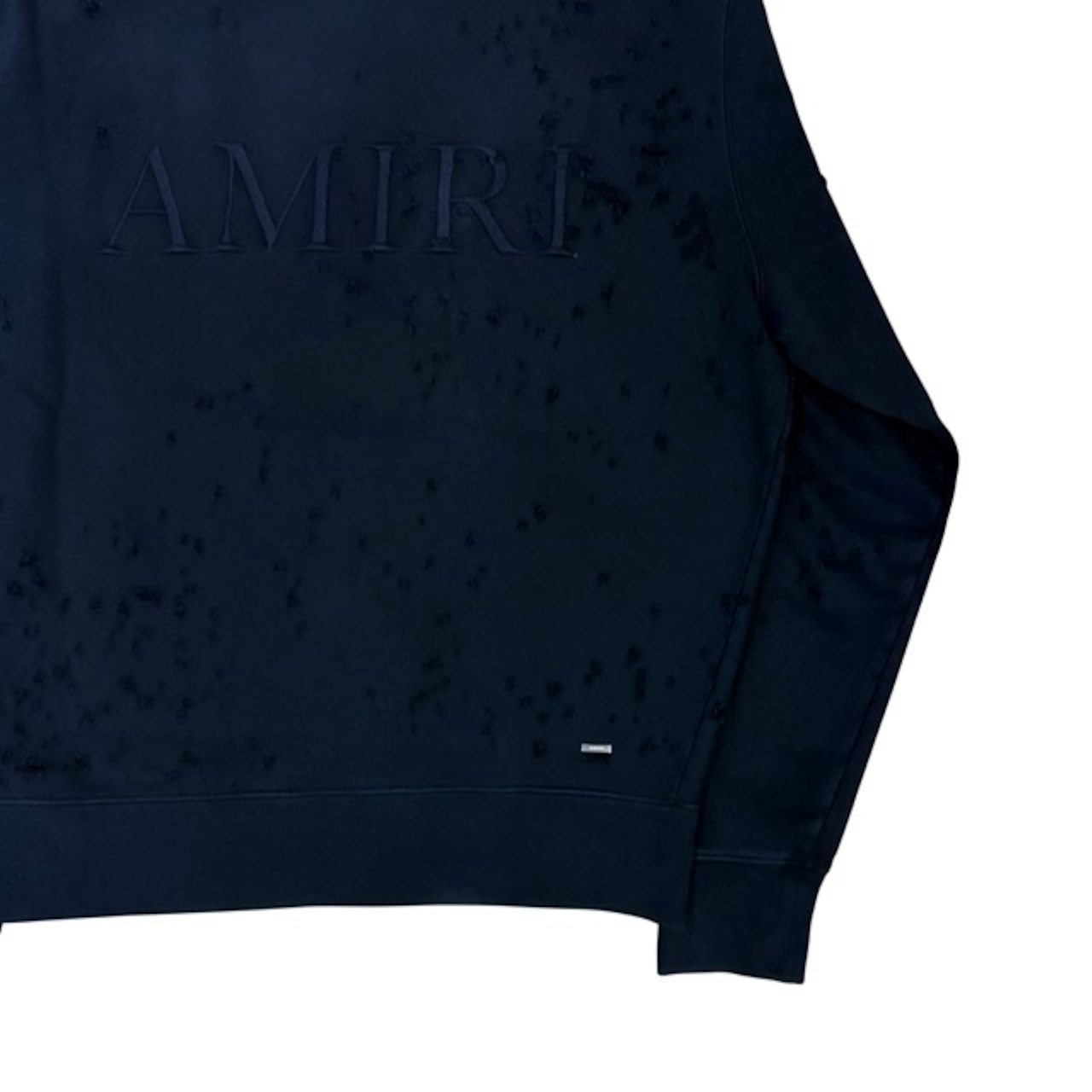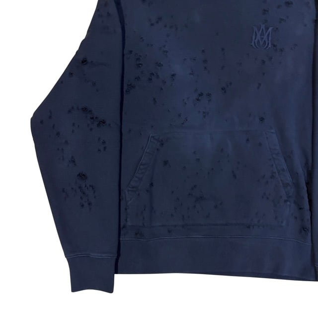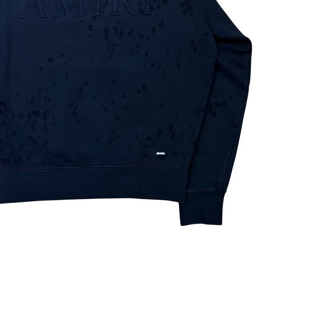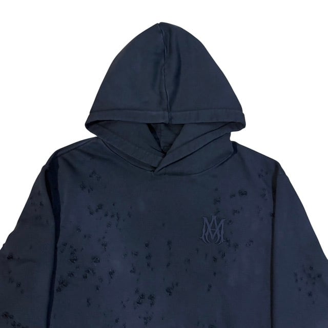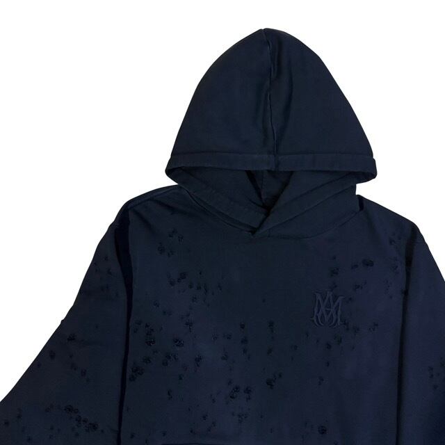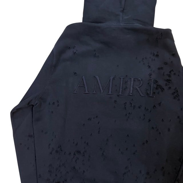 全体的にダメージ加工があり、AMIRIのロゴが同系色で胸元にデザインされているフーディートップス。