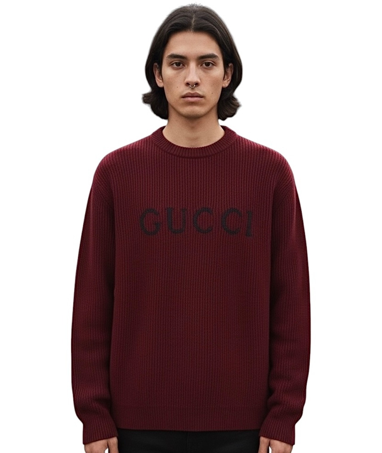 グッチ ロッソ アンコラ レッドとブラウンのウールカシミアリブニットを使用したこの セーターは、特徴的なロゴインターシャが特徴です。