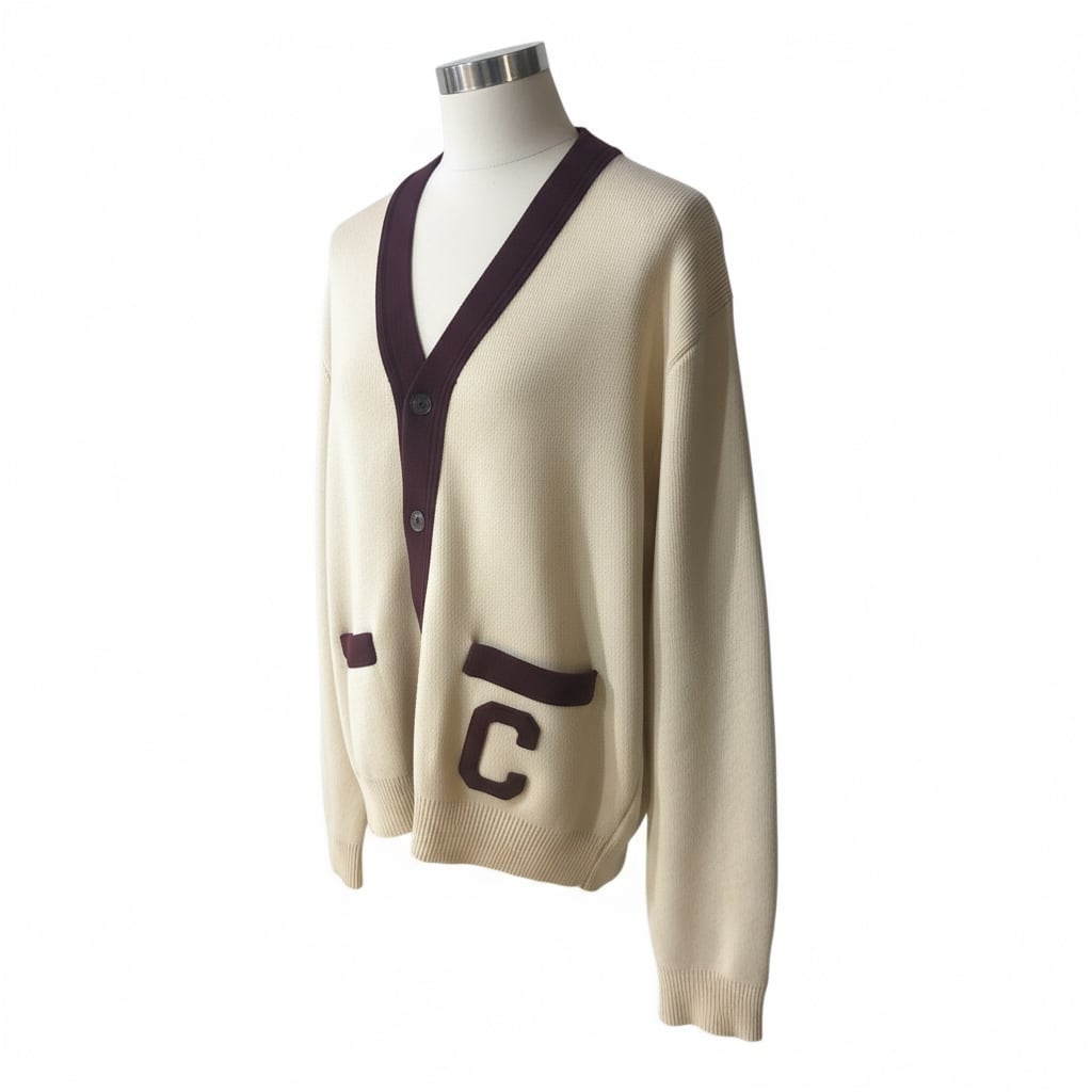 クリーム色とバーガンディーの配色が可愛く、デニムでも映えますし、ベージュ系のボトムスと合わせてもクラシックなレトロなコーディネートも叶います。