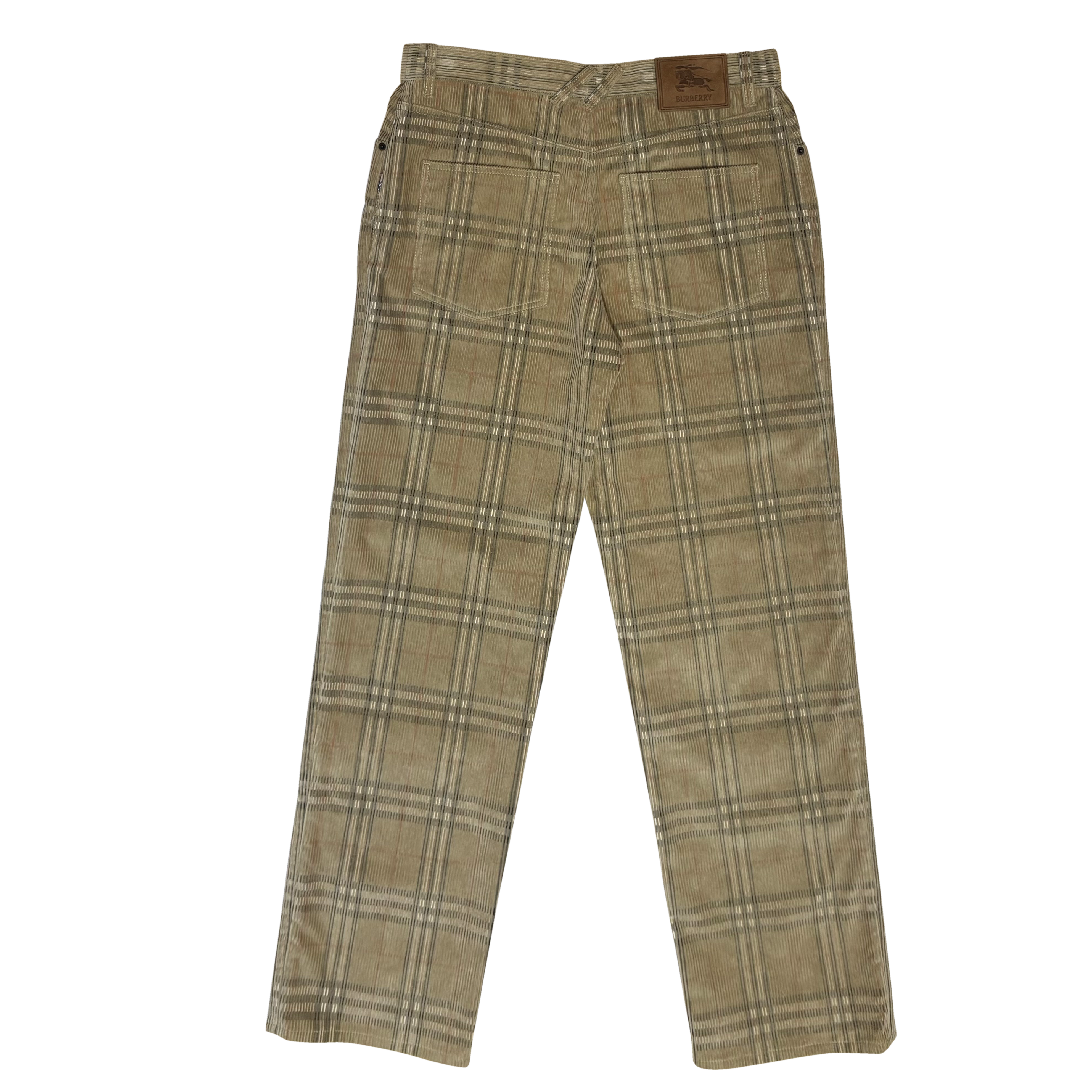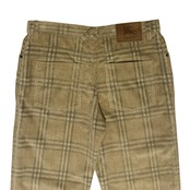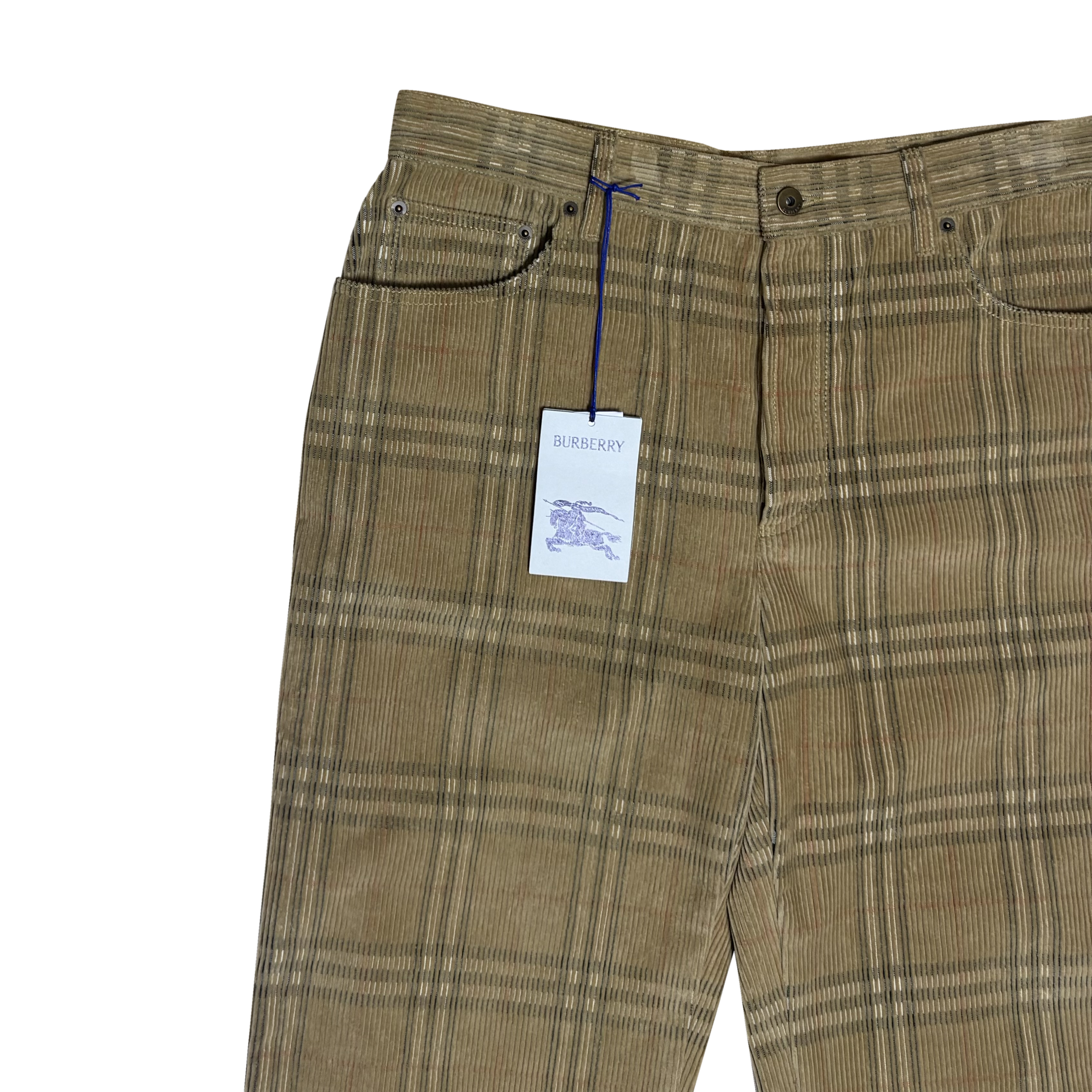 バーバリーチェックを配しました。斜めのベルトループをフィーチャーした5ポケットデザインでスエードパッチに「馬上の騎士」デザインをエンボスしました。